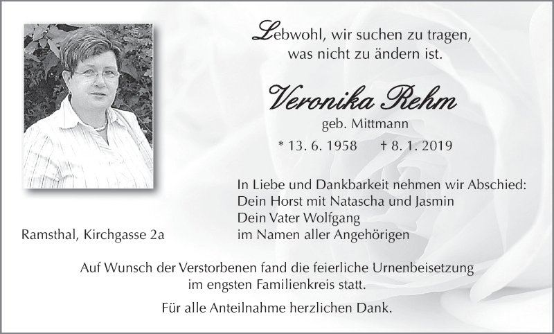 Hier finden Sie alle Traueranzeigen aus der Zeitung, die bisher für Veronika Rehm erschienen sind. Weitere Traueranzeigen, die in der Zeitung erscheinen, werden hier ebenfalls aufgelistet