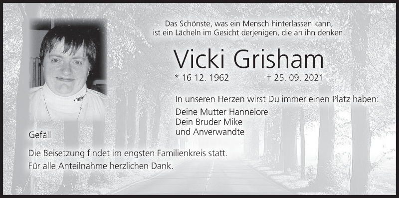 Hier finden Sie alle Traueranzeigen aus der Zeitung, die bisher für Vicki Grisham erschienen sind. Weitere Traueranzeigen, die in der Zeitung erscheinen, werden hier ebenfalls aufgelistet
