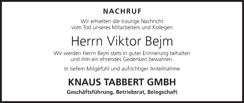Hier finden Sie alle Traueranzeigen aus der Zeitung, die bisher für Viktor Bejm erschienen sind. Weitere Traueranzeigen, die in der Zeitung erscheinen, werden hier ebenfalls aufgelistet