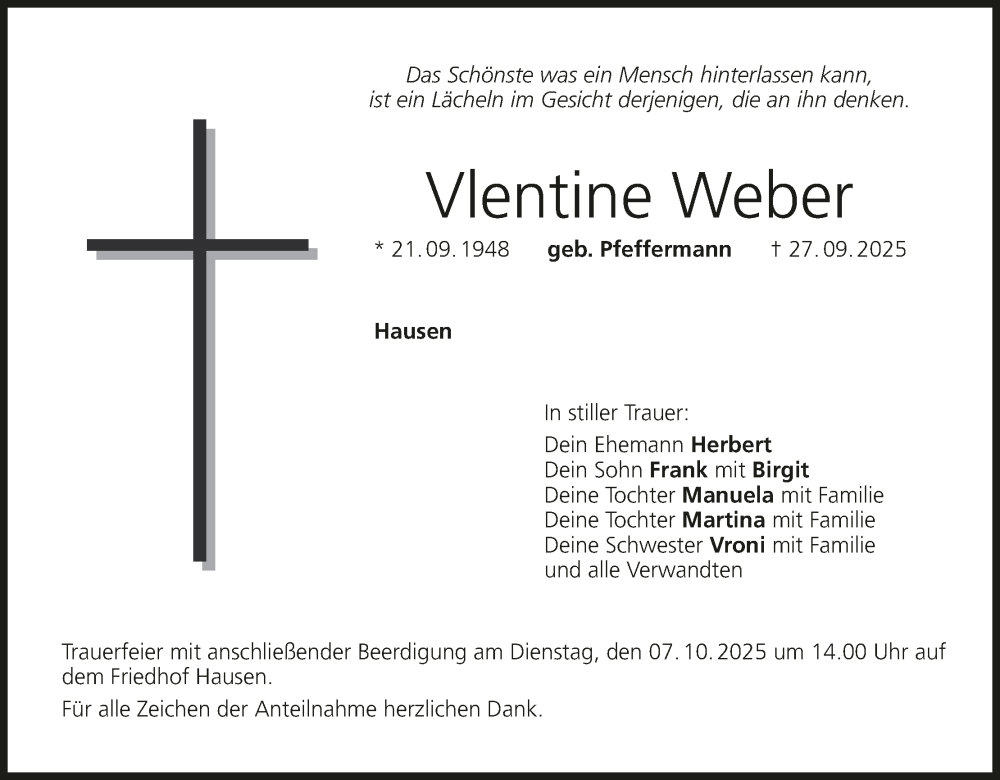 Hier finden Sie alle Traueranzeigen aus der Zeitung, die bisher für Vlentine Weber erschienen sind. Weitere Traueranzeigen, die in der Zeitung erscheinen, werden hier ebenfalls aufgelistet