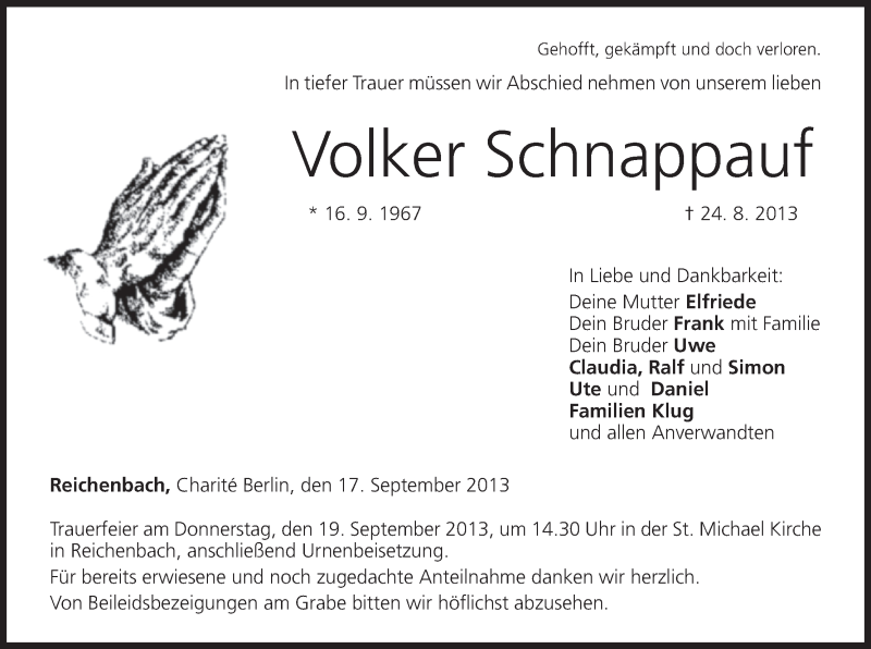 Hier finden Sie alle Traueranzeigen aus der Zeitung, die bisher für Volker Schnappauf erschienen sind. Weitere Traueranzeigen, die in der Zeitung erscheinen, werden hier ebenfalls aufgelistet