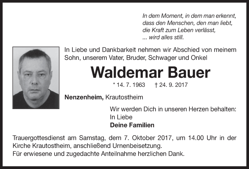 Hier finden Sie alle Traueranzeigen aus der Zeitung, die bisher für Waldemar Bauer erschienen sind. Weitere Traueranzeigen, die in der Zeitung erscheinen, werden hier ebenfalls aufgelistet