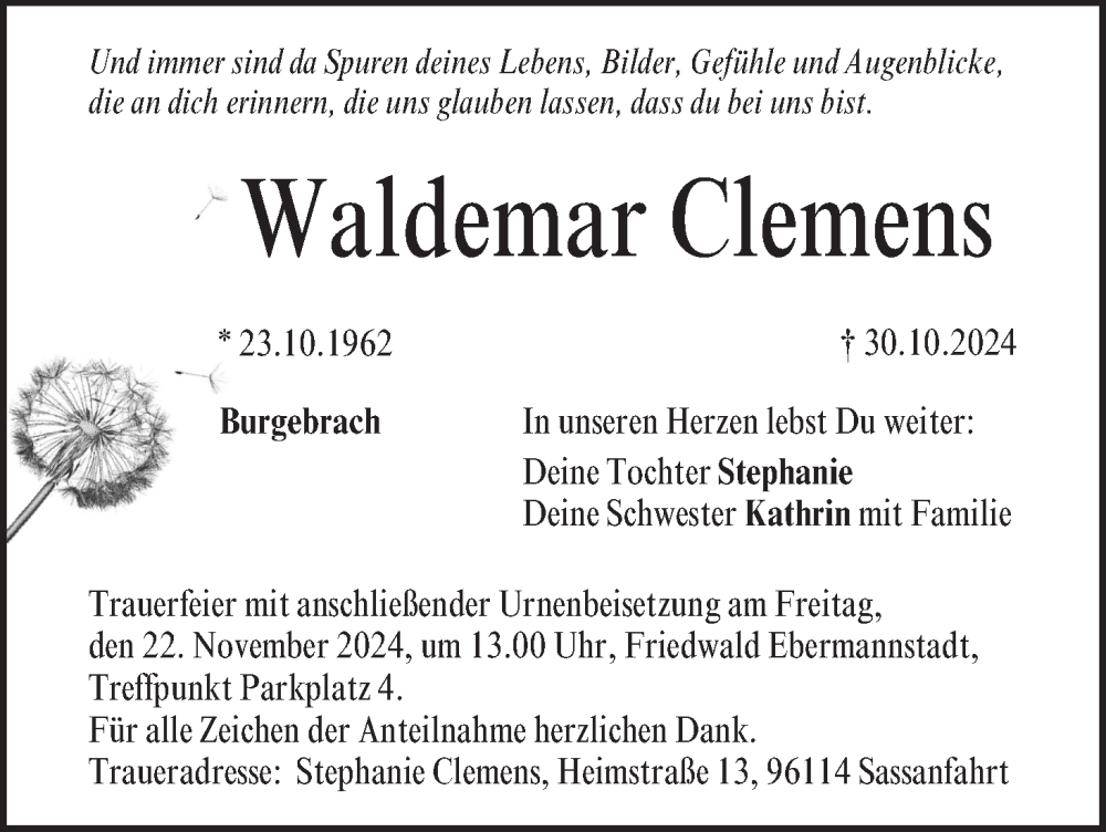 Hier finden Sie alle Traueranzeigen aus der Zeitung, die bisher für Waldemar Clemens erschienen sind. Weitere Traueranzeigen, die in der Zeitung erscheinen, werden hier ebenfalls aufgelistet