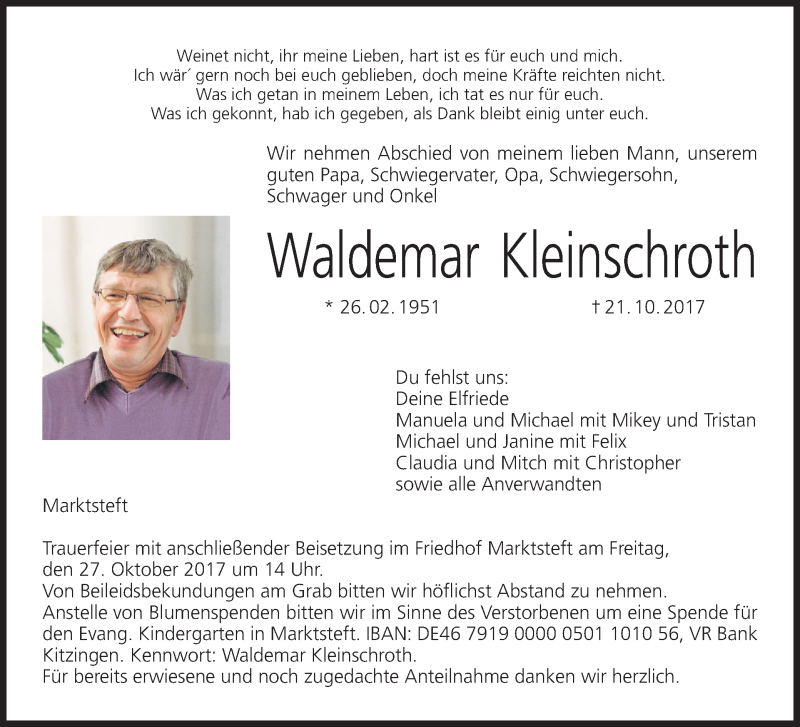 Hier finden Sie alle Traueranzeigen aus der Zeitung, die bisher für Waldemar Kleinschroth erschienen sind. Weitere Traueranzeigen, die in der Zeitung erscheinen, werden hier ebenfalls aufgelistet