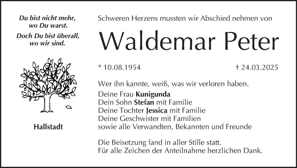 Hier finden Sie alle Traueranzeigen aus der Zeitung, die bisher für Waldemar Peter erschienen sind. Weitere Traueranzeigen, die in der Zeitung erscheinen, werden hier ebenfalls aufgelistet