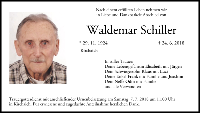 Hier finden Sie alle Traueranzeigen aus der Zeitung, die bisher für Waldemar Schiller erschienen sind. Weitere Traueranzeigen, die in der Zeitung erscheinen, werden hier ebenfalls aufgelistet