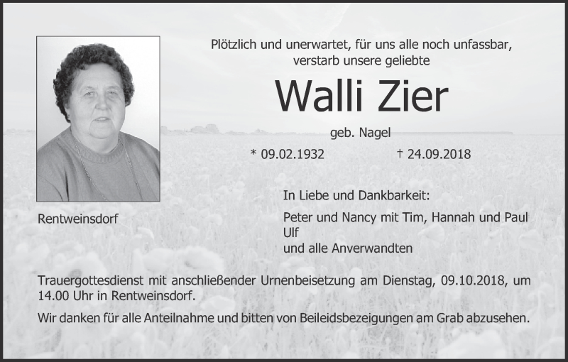 Hier finden Sie alle Traueranzeigen aus der Zeitung, die bisher für Walli Zier erschienen sind. Weitere Traueranzeigen, die in der Zeitung erscheinen, werden hier ebenfalls aufgelistet