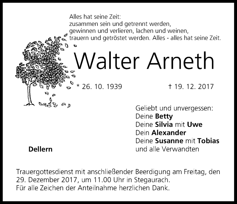 Hier finden Sie alle Traueranzeigen aus der Zeitung, die bisher für Walter Arneth erschienen sind. Weitere Traueranzeigen, die in der Zeitung erscheinen, werden hier ebenfalls aufgelistet