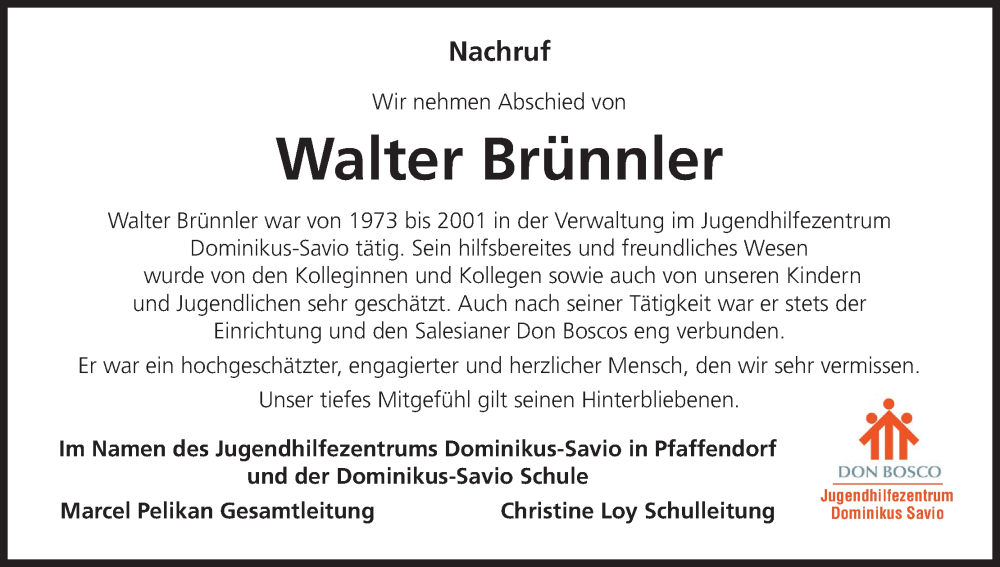 Hier finden Sie alle Traueranzeigen aus der Zeitung, die bisher für Walter Brünnler erschienen sind. Weitere Traueranzeigen, die in der Zeitung erscheinen, werden hier ebenfalls aufgelistet