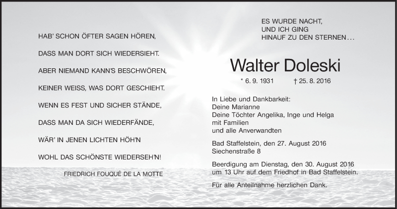 Hier finden Sie alle Traueranzeigen aus der Zeitung, die bisher für Walter Doleski erschienen sind. Weitere Traueranzeigen, die in der Zeitung erscheinen, werden hier ebenfalls aufgelistet