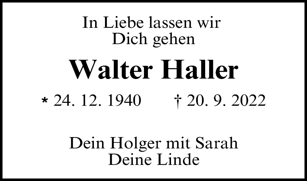 Hier finden Sie alle Traueranzeigen aus der Zeitung, die bisher für Walter Haller erschienen sind. Weitere Traueranzeigen, die in der Zeitung erscheinen, werden hier ebenfalls aufgelistet