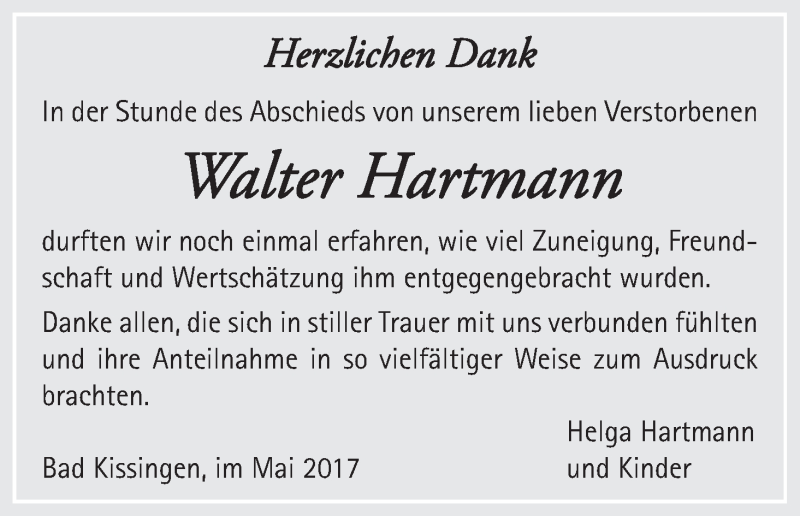 Hier finden Sie alle Traueranzeigen aus der Zeitung, die bisher für Walter Hartmann erschienen sind. Weitere Traueranzeigen, die in der Zeitung erscheinen, werden hier ebenfalls aufgelistet