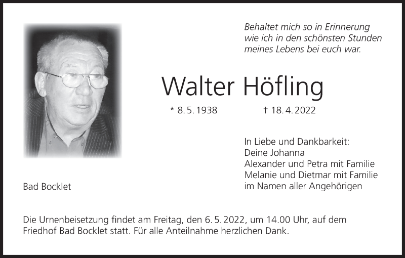 Hier finden Sie alle Traueranzeigen aus der Zeitung, die bisher für Walter Höfling erschienen sind. Weitere Traueranzeigen, die in der Zeitung erscheinen, werden hier ebenfalls aufgelistet