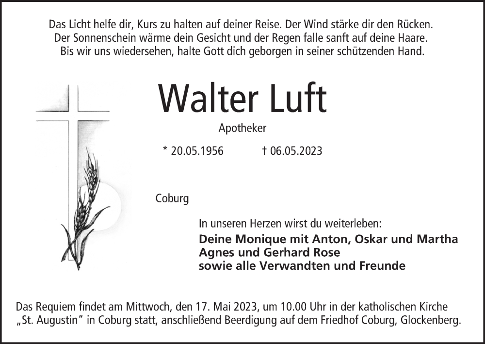 Hier finden Sie alle Traueranzeigen aus der Zeitung, die bisher für Walter Luft erschienen sind. Weitere Traueranzeigen, die in der Zeitung erscheinen, werden hier ebenfalls aufgelistet