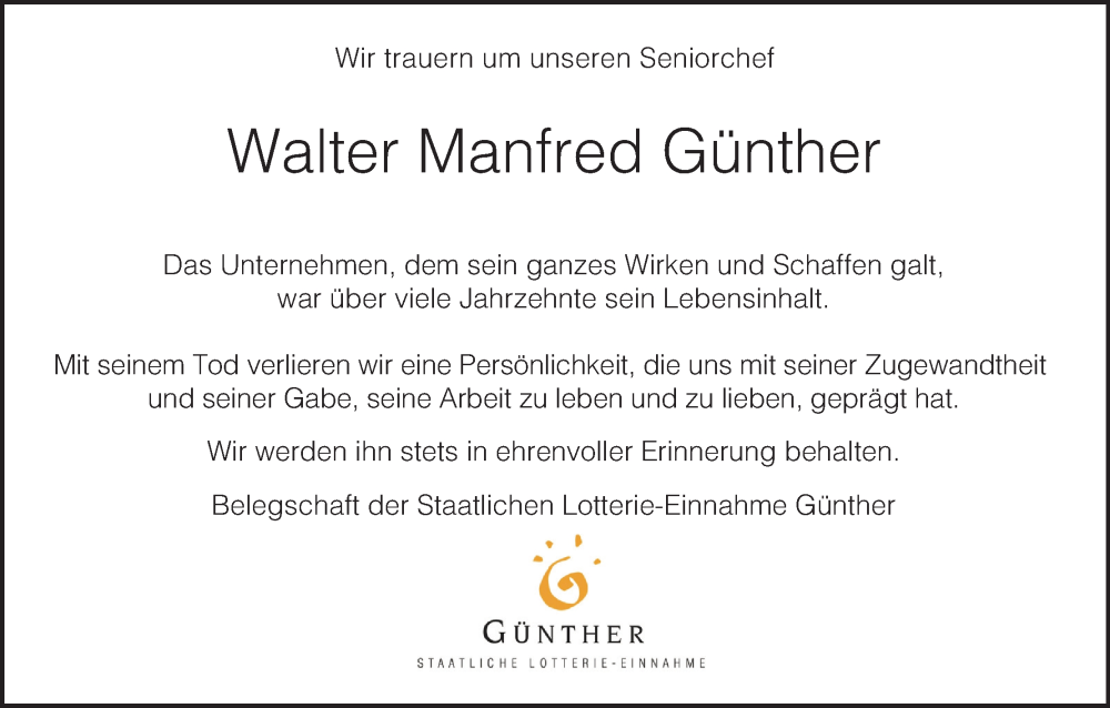 Hier finden Sie alle Traueranzeigen aus der Zeitung, die bisher für Walter Manfred Günther erschienen sind. Weitere Traueranzeigen, die in der Zeitung erscheinen, werden hier ebenfalls aufgelistet