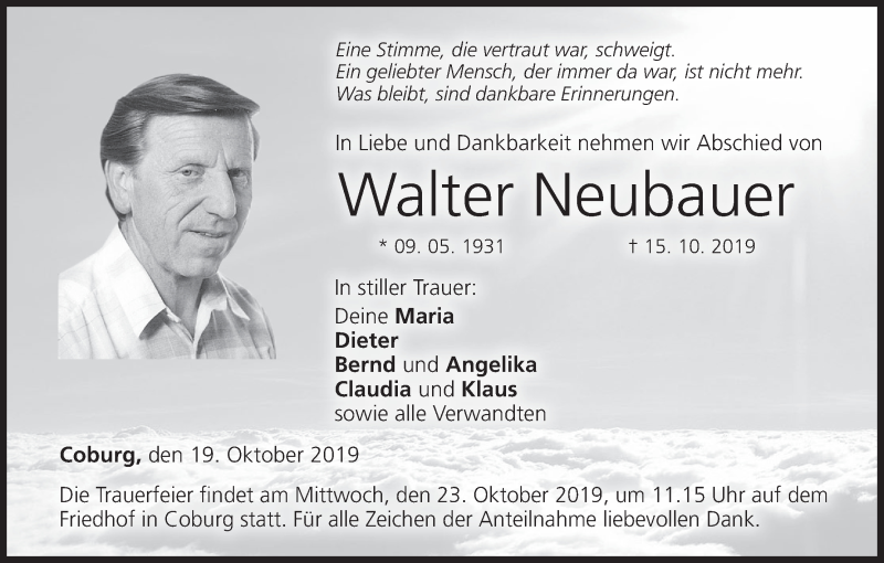 Hier finden Sie alle Traueranzeigen aus der Zeitung, die bisher für Walter Neubauer erschienen sind. Weitere Traueranzeigen, die in der Zeitung erscheinen, werden hier ebenfalls aufgelistet