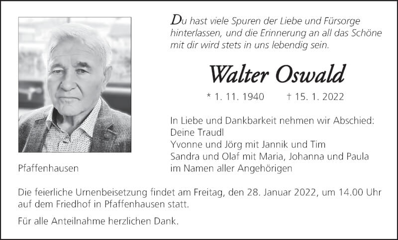 Hier finden Sie alle Traueranzeigen aus der Zeitung, die bisher für Walter Oswald erschienen sind. Weitere Traueranzeigen, die in der Zeitung erscheinen, werden hier ebenfalls aufgelistet