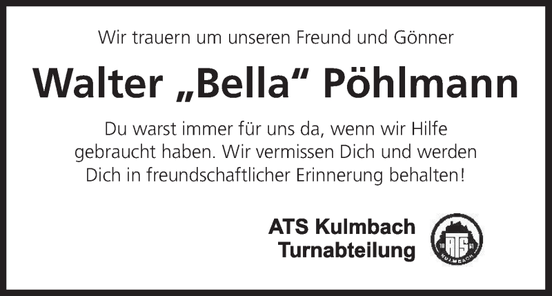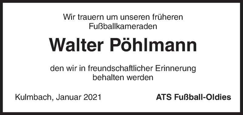Hier finden Sie alle Traueranzeigen aus der Zeitung, die bisher für Walter Pöhlmann erschienen sind. Weitere Traueranzeigen, die in der Zeitung erscheinen, werden hier ebenfalls aufgelistet