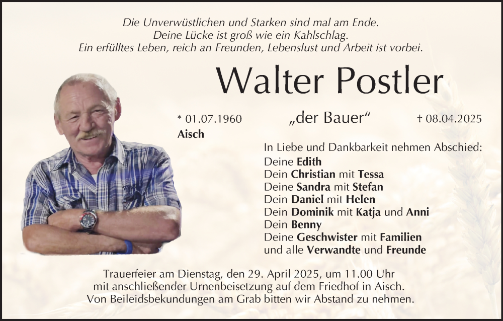 Hier finden Sie alle Traueranzeigen aus der Zeitung, die bisher für Walter Postler erschienen sind. Weitere Traueranzeigen, die in der Zeitung erscheinen, werden hier ebenfalls aufgelistet