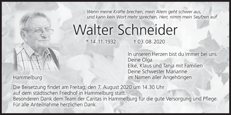 Hier finden Sie alle Traueranzeigen aus der Zeitung, die bisher für Walter Schneider erschienen sind. Weitere Traueranzeigen, die in der Zeitung erscheinen, werden hier ebenfalls aufgelistet