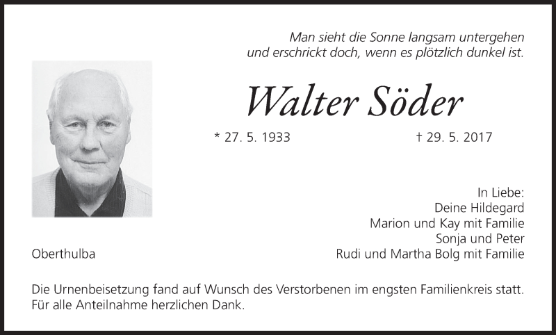 Hier finden Sie alle Traueranzeigen aus der Zeitung, die bisher für Walter Söder erschienen sind. Weitere Traueranzeigen, die in der Zeitung erscheinen, werden hier ebenfalls aufgelistet