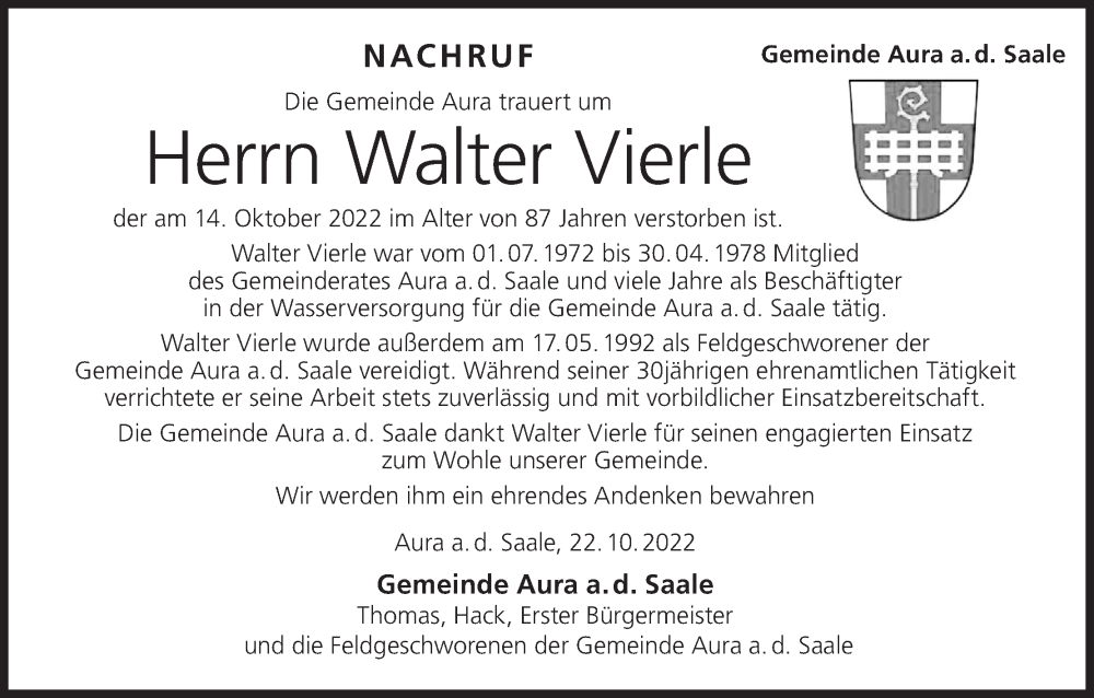 Hier finden Sie alle Traueranzeigen aus der Zeitung, die bisher für Walter Vierle erschienen sind. Weitere Traueranzeigen, die in der Zeitung erscheinen, werden hier ebenfalls aufgelistet