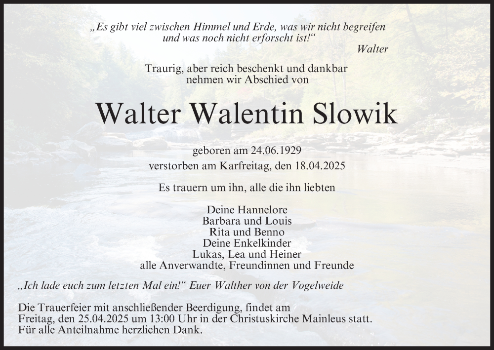 Hier finden Sie alle Traueranzeigen aus der Zeitung, die bisher für Walter Walentin Slowik erschienen sind. Weitere Traueranzeigen, die in der Zeitung erscheinen, werden hier ebenfalls aufgelistet
