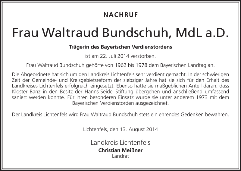 Hier finden Sie alle Traueranzeigen aus der Zeitung, die bisher für Waltraud Bundschuh erschienen sind. Weitere Traueranzeigen, die in der Zeitung erscheinen, werden hier ebenfalls aufgelistet