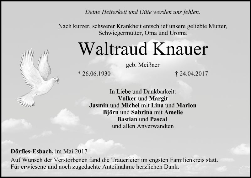 Hier finden Sie alle Traueranzeigen aus der Zeitung, die bisher für Waltraud Knauer erschienen sind. Weitere Traueranzeigen, die in der Zeitung erscheinen, werden hier ebenfalls aufgelistet