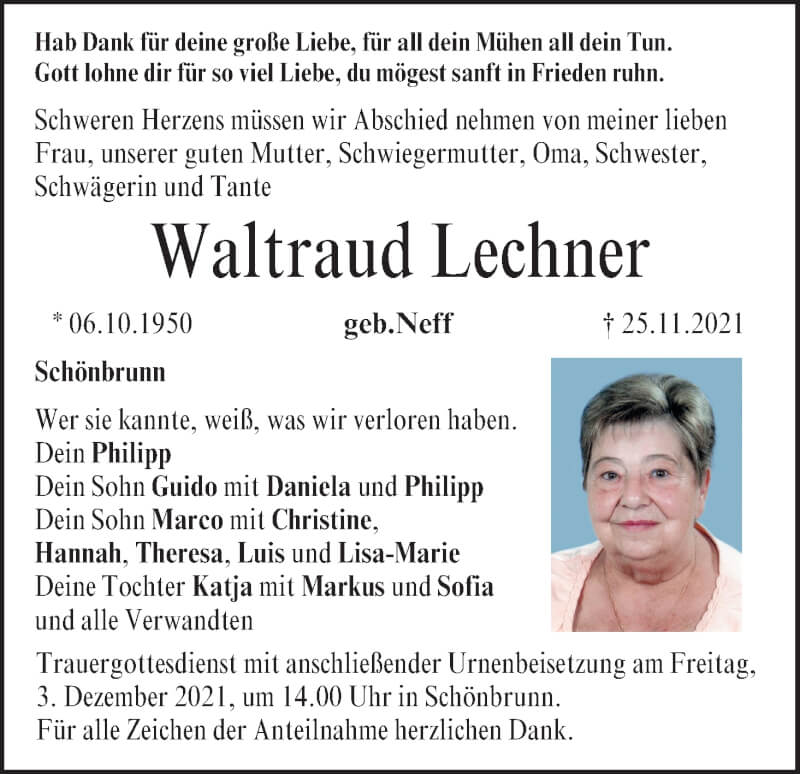 Hier finden Sie alle Traueranzeigen aus der Zeitung, die bisher für Waltraud Lechner erschienen sind. Weitere Traueranzeigen, die in der Zeitung erscheinen, werden hier ebenfalls aufgelistet