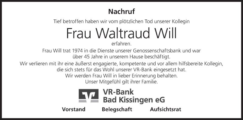 Hier finden Sie alle Traueranzeigen aus der Zeitung, die bisher für Waltraud Will erschienen sind. Weitere Traueranzeigen, die in der Zeitung erscheinen, werden hier ebenfalls aufgelistet