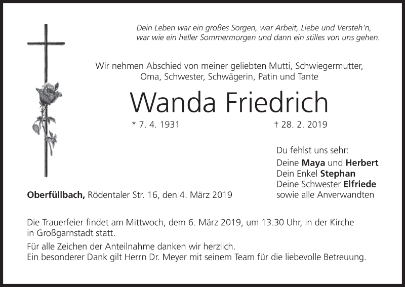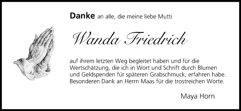 Hier finden Sie alle Traueranzeigen aus der Zeitung, die bisher für Wanda Friedrich erschienen sind. Weitere Traueranzeigen, die in der Zeitung erscheinen, werden hier ebenfalls aufgelistet