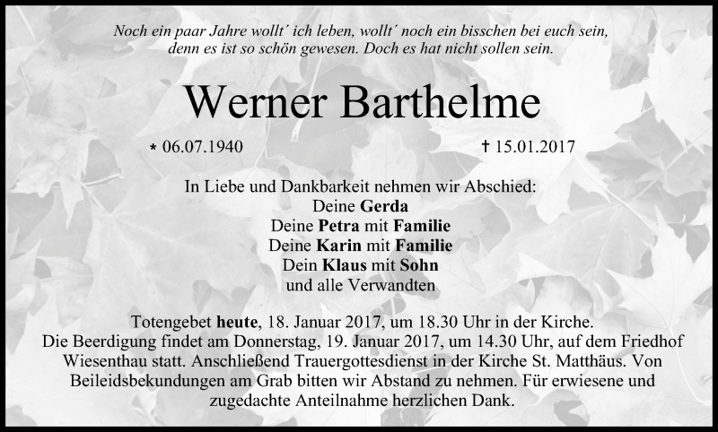 Hier finden Sie alle Traueranzeigen aus der Zeitung, die bisher für Werner Barthelme erschienen sind. Weitere Traueranzeigen, die in der Zeitung erscheinen, werden hier ebenfalls aufgelistet