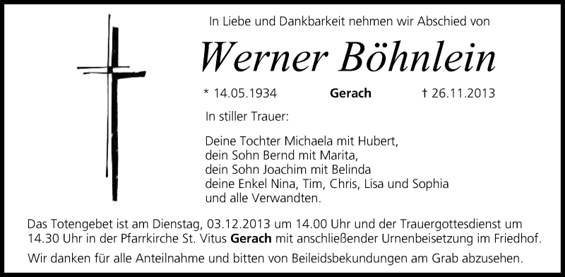 Hier finden Sie alle Traueranzeigen aus der Zeitung, die bisher für Werner Böhnlein erschienen sind. Weitere Traueranzeigen, die in der Zeitung erscheinen, werden hier ebenfalls aufgelistet