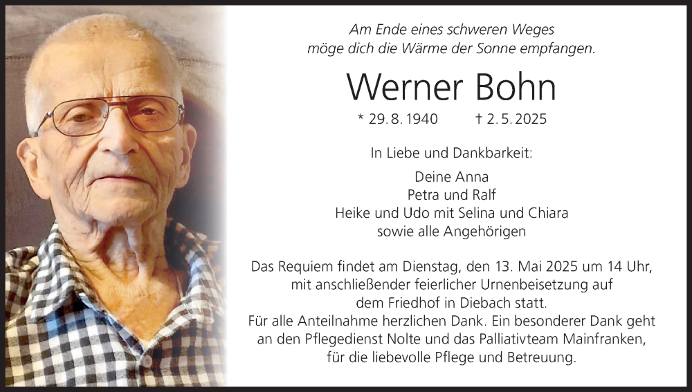 Hier finden Sie alle Traueranzeigen aus der Zeitung, die bisher für Werner Bohn erschienen sind. Weitere Traueranzeigen, die in der Zeitung erscheinen, werden hier ebenfalls aufgelistet
