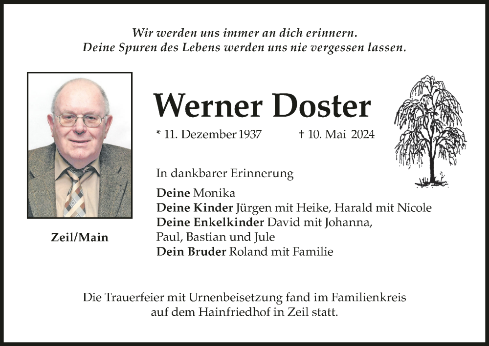 Hier finden Sie alle Traueranzeigen aus der Zeitung, die bisher für Werner Doster erschienen sind. Weitere Traueranzeigen, die in der Zeitung erscheinen, werden hier ebenfalls aufgelistet