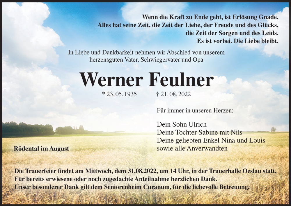 Hier finden Sie alle Traueranzeigen aus der Zeitung, die bisher für Werner Feulner erschienen sind. Weitere Traueranzeigen, die in der Zeitung erscheinen, werden hier ebenfalls aufgelistet