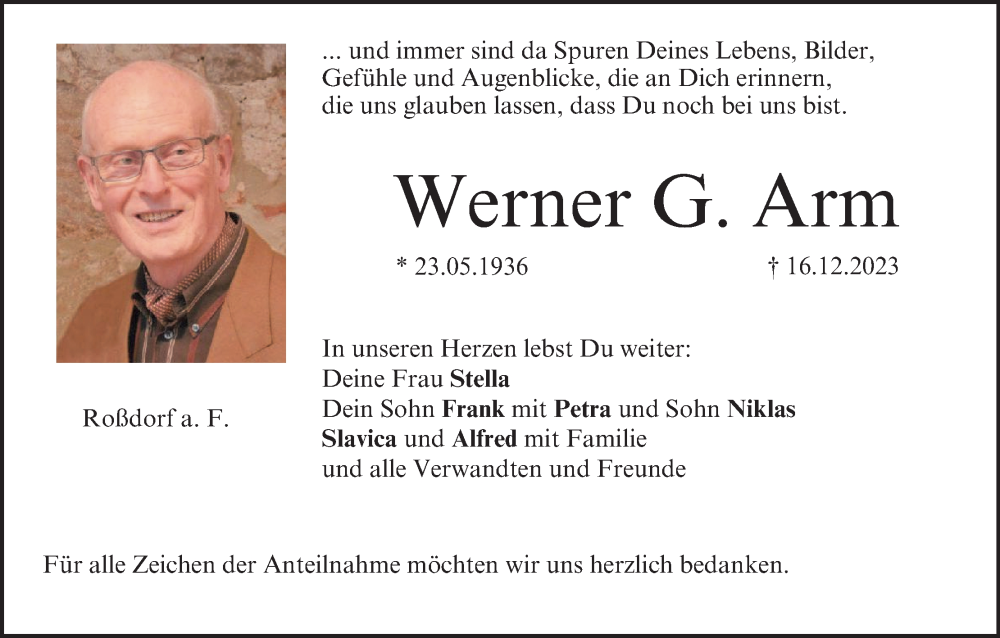 Hier finden Sie alle Traueranzeigen aus der Zeitung, die bisher für Werner G. Arm erschienen sind. Weitere Traueranzeigen, die in der Zeitung erscheinen, werden hier ebenfalls aufgelistet