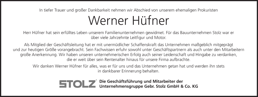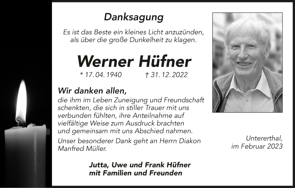 Hier finden Sie alle Traueranzeigen aus der Zeitung, die bisher für Werner Hüfner erschienen sind. Weitere Traueranzeigen, die in der Zeitung erscheinen, werden hier ebenfalls aufgelistet