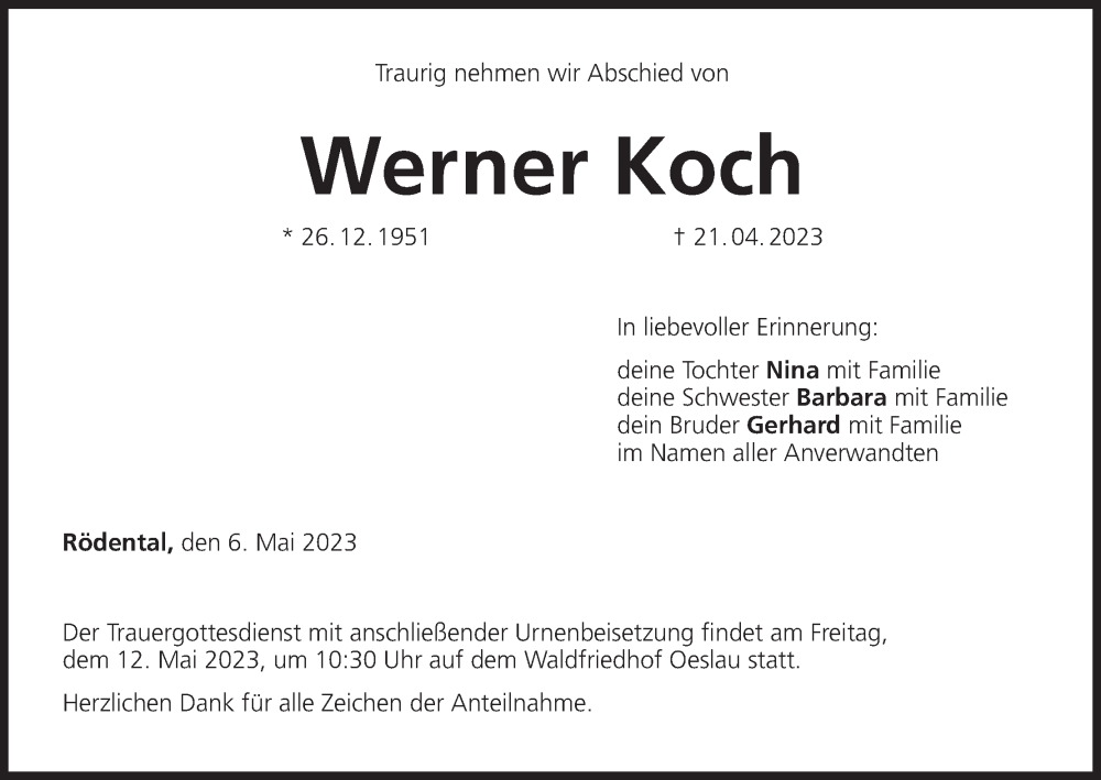 Hier finden Sie alle Traueranzeigen aus der Zeitung, die bisher für Werner Koch erschienen sind. Weitere Traueranzeigen, die in der Zeitung erscheinen, werden hier ebenfalls aufgelistet