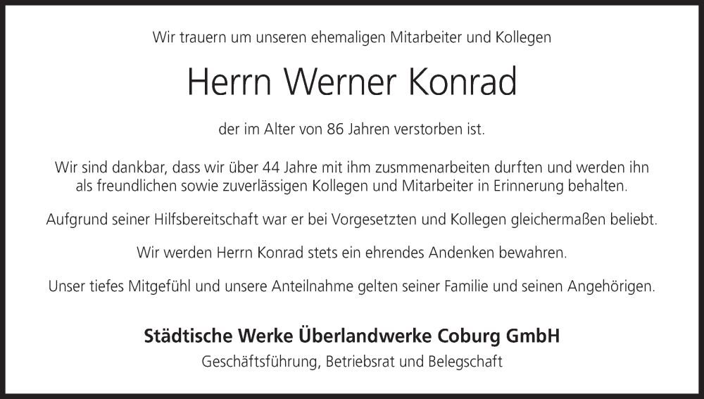 Hier finden Sie alle Traueranzeigen aus der Zeitung, die bisher für Werner Konrad erschienen sind. Weitere Traueranzeigen, die in der Zeitung erscheinen, werden hier ebenfalls aufgelistet