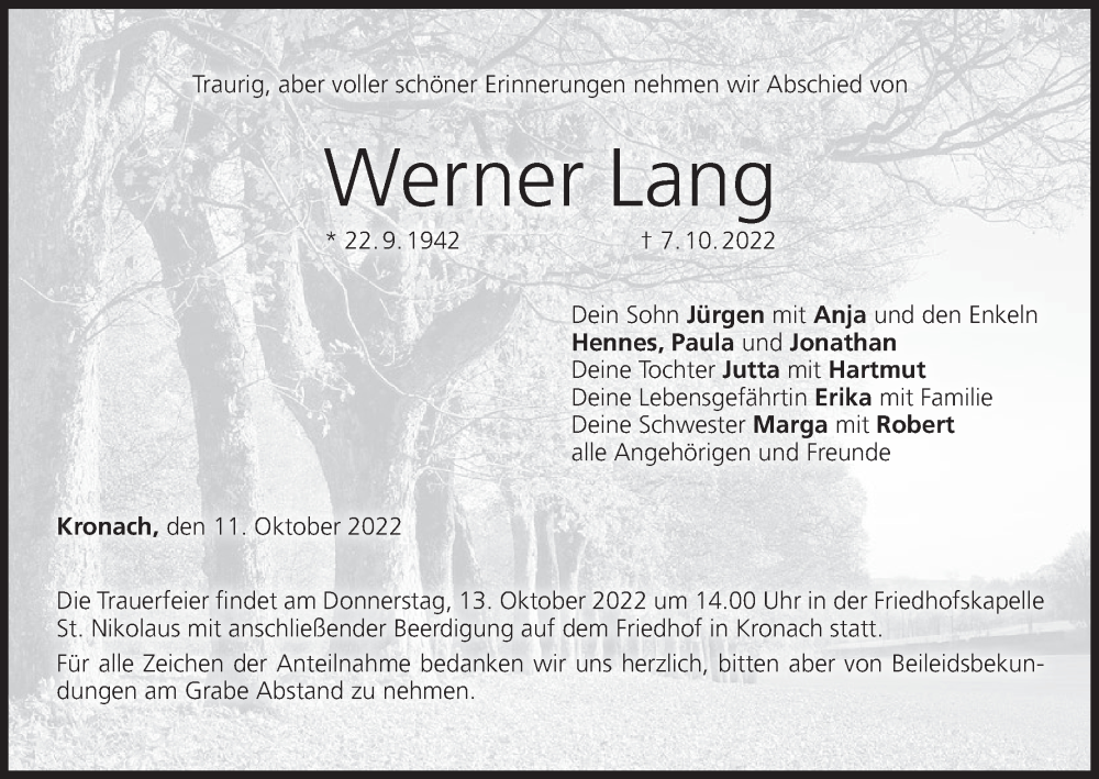 Hier finden Sie alle Traueranzeigen aus der Zeitung, die bisher für Werner Lang erschienen sind. Weitere Traueranzeigen, die in der Zeitung erscheinen, werden hier ebenfalls aufgelistet