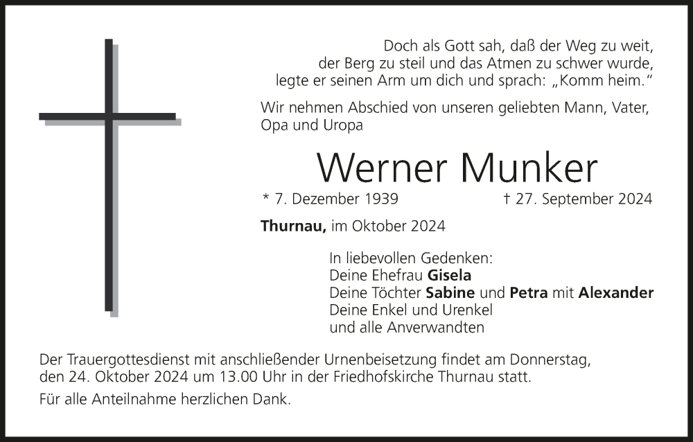 Hier finden Sie alle Traueranzeigen aus der Zeitung, die bisher für Werner Munker erschienen sind. Weitere Traueranzeigen, die in der Zeitung erscheinen, werden hier ebenfalls aufgelistet