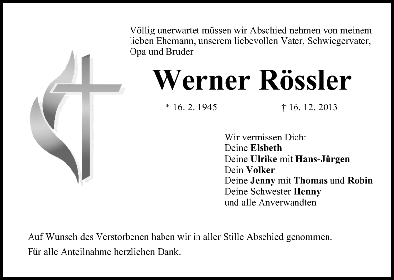 Hier finden Sie alle Traueranzeigen aus der Zeitung, die bisher für Werner Rössler erschienen sind. Weitere Traueranzeigen, die in der Zeitung erscheinen, werden hier ebenfalls aufgelistet