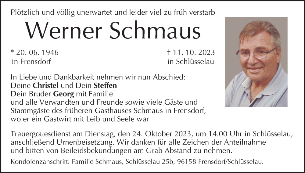 Hier finden Sie alle Traueranzeigen aus der Zeitung, die bisher für Werner Schmaus erschienen sind. Weitere Traueranzeigen, die in der Zeitung erscheinen, werden hier ebenfalls aufgelistet