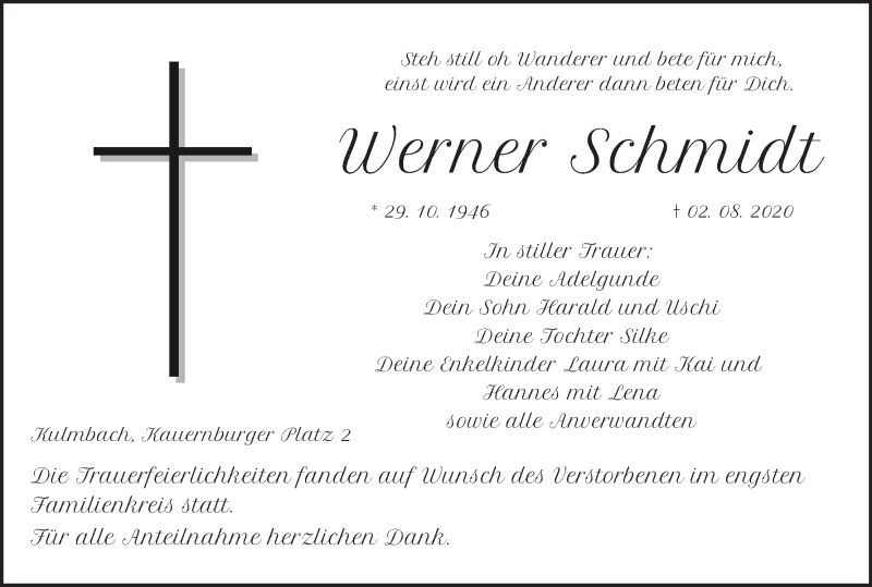 Hier finden Sie alle Traueranzeigen aus der Zeitung, die bisher für Werner Schmidt erschienen sind. Weitere Traueranzeigen, die in der Zeitung erscheinen, werden hier ebenfalls aufgelistet