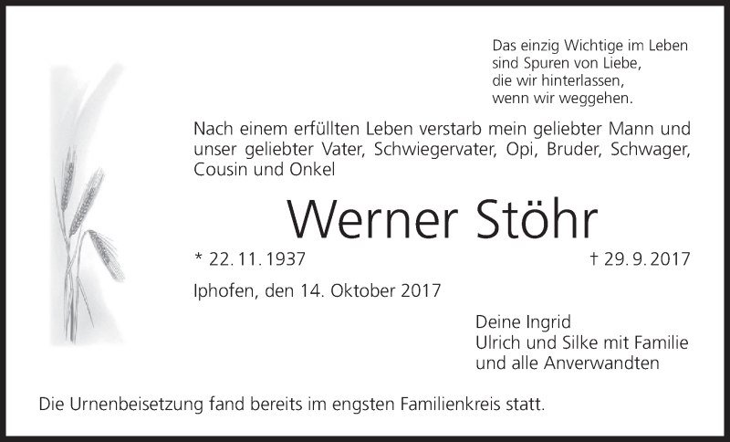 Hier finden Sie alle Traueranzeigen aus der Zeitung, die bisher für Werner Stöhr erschienen sind. Weitere Traueranzeigen, die in der Zeitung erscheinen, werden hier ebenfalls aufgelistet