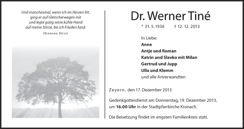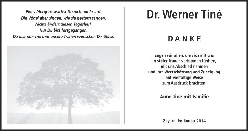 Hier finden Sie alle Traueranzeigen aus der Zeitung, die bisher für Werner Tiné erschienen sind. Weitere Traueranzeigen, die in der Zeitung erscheinen, werden hier ebenfalls aufgelistet
