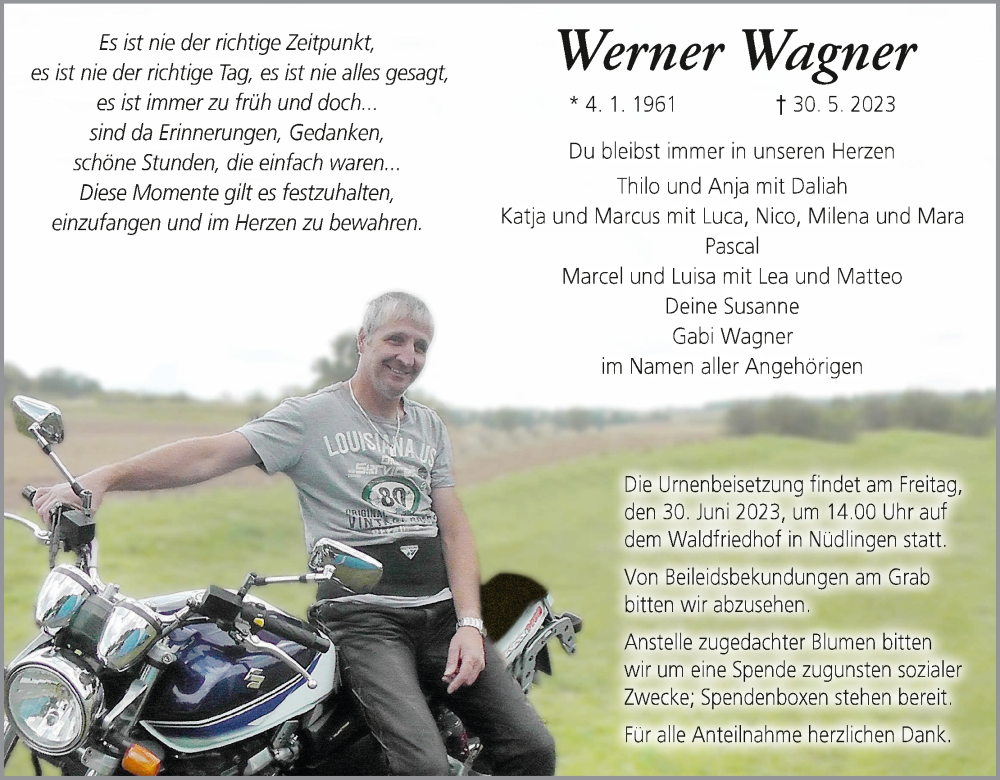 Hier finden Sie alle Traueranzeigen aus der Zeitung, die bisher für Werner Wagner erschienen sind. Weitere Traueranzeigen, die in der Zeitung erscheinen, werden hier ebenfalls aufgelistet