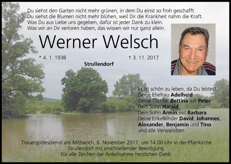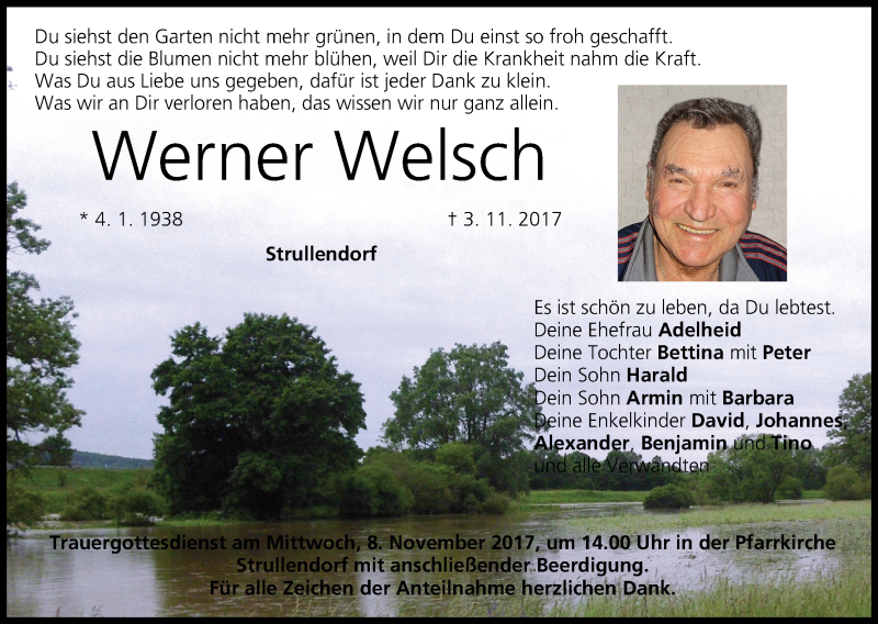 Hier finden Sie alle Traueranzeigen aus der Zeitung, die bisher für Werner Welsch erschienen sind. Weitere Traueranzeigen, die in der Zeitung erscheinen, werden hier ebenfalls aufgelistet